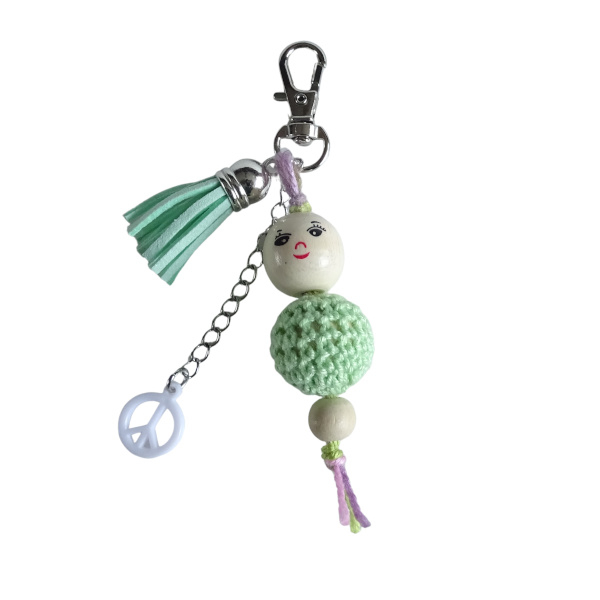 Ze hangt aan een musketonhaak samen met een mintgroen suède kwastje en een witte peace bedel. Het poppetje is van gemaakt van houten kralen, waarvan het lijfje is omhaakt met mintgroen katoen.