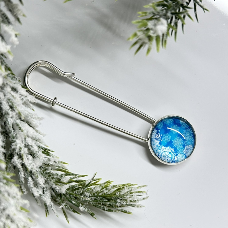 In de setting van deze speld dwarrelt de sneeuw voor een witte kerst. De cabochon is mooi groot waardoor de speld zeker zal opvallen.