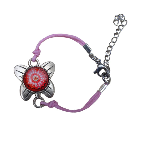 Dit armbandje is gemaakt van dubbeldraads roze waxkoord. De eyecatcher van de armband is de vlinder waarvan het buikje schitterd door een mooie cabochon in vrolijke roze/rood tinten.